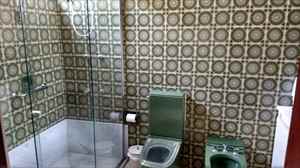 Banhos com piso em cerâmica, bancada em mármore, azulejos na parede e box em blindex.
